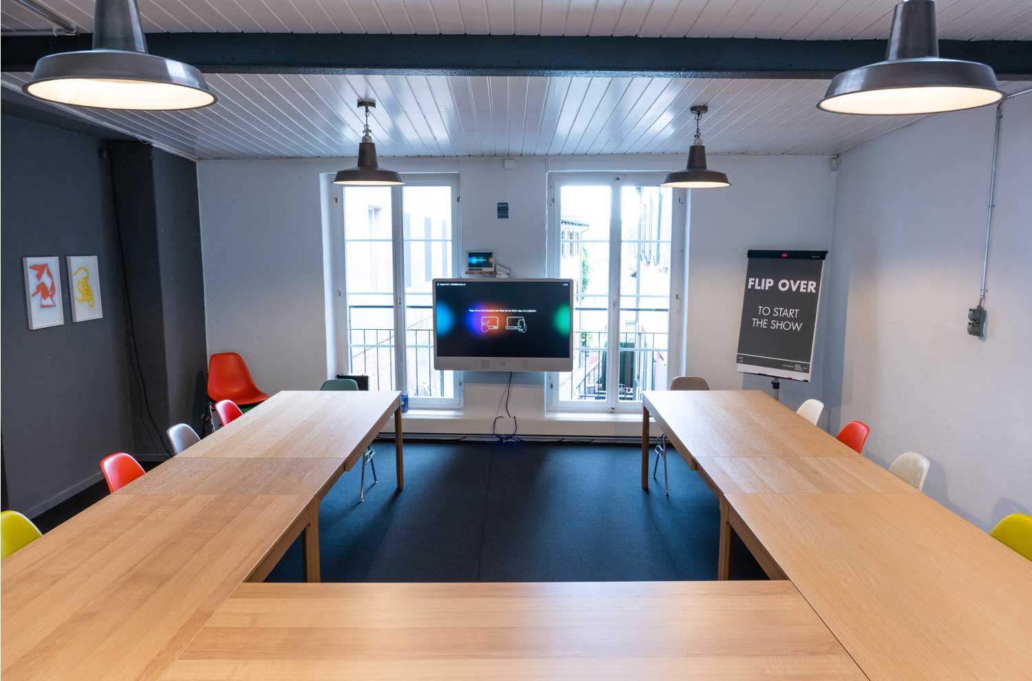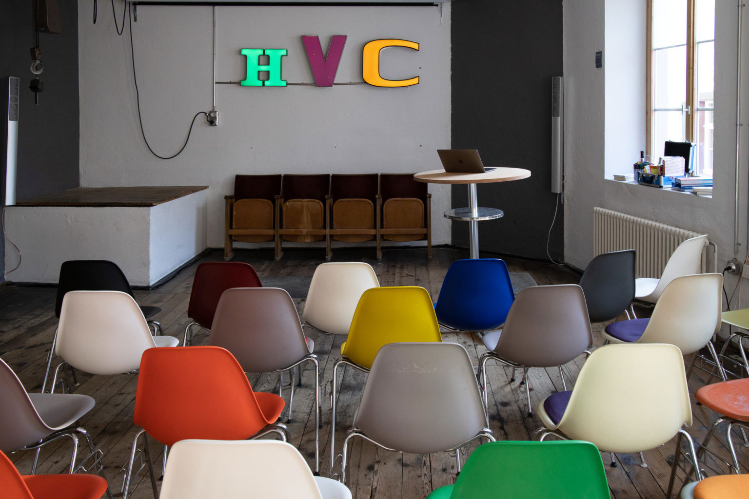 Der «Rheinraum» hat seinen Namen vom Blick auf den Rhein, den man von hier aus geniesst. Mehr noch, unter dem Raum rauscht dezent ein Bach hindurch. Der Rheinraum verfügt über bewegliche Whiteboards, Flipcharts, einen grossen Bildschirm sowie Tische und bequeme Eams-Chairs als Sitzgelegenheiten. In U-Bestuhlung haben bis zu 16 Personen an Tischen Platz. Der Raum ist vom restlichen HVC LAB durch eine schalldichte Tür getrennt und eignet sich damit besonders gut auch für vertrauliche Meetings und Workshops.